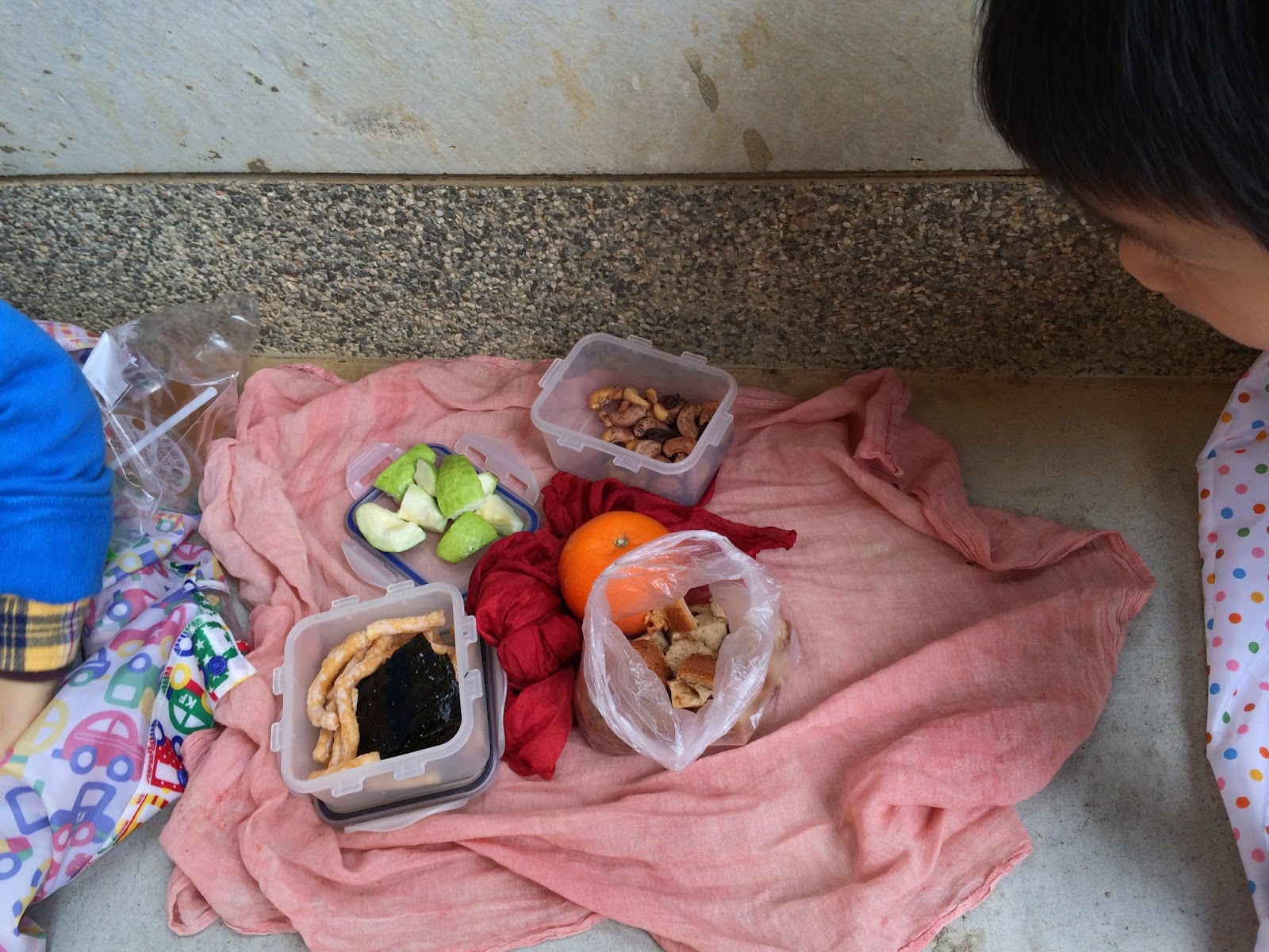 好不容易哄了帶開,才沒走幾步,討抱了。我跟老師都希望剩下一點點的路程就到午餐的地點,鼓勵她再走一下,不過這孩子擺明了就是要人安慰...我蹲下來安撫,未果,老師安頓小哥們後再繞回來抱她帶離現場。
